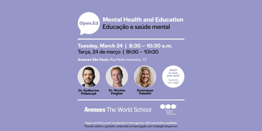 A conversa contará com a participação do psiquiatra da infância e adolescência Guilherme Polanczyk, professor da Faculdade de Medicina da Universidade de São Paulo (USP), e do psicólogo Nicolau Pergher, doutor em Psicologia Experimental pela USP e psicólogo escolar da Avenues São Paulo. A mediação será realizada por Dominique Paladini, diretora de bem-estar estudantil da escola.