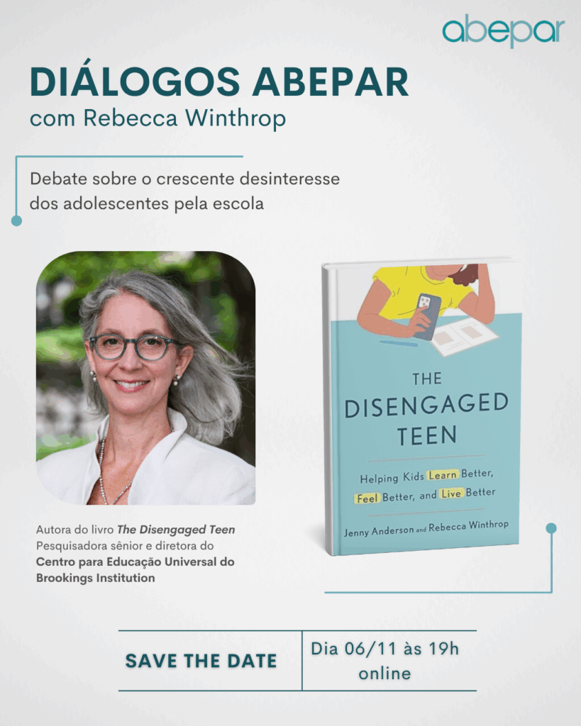 A Abepar anuncia a participação de Rebecca Winthrop no próximo “Diálogos Abepar”, encontro online que acontece no próximo dia 6 de novembro às 19 horas. Winthrop é autora do livro The Disengaged Teen – The Disengaged Teen: Helping Kids Learn Better, Feel Better, and Live Better, em coautoria com a pesquisadora Jenny Anderson.